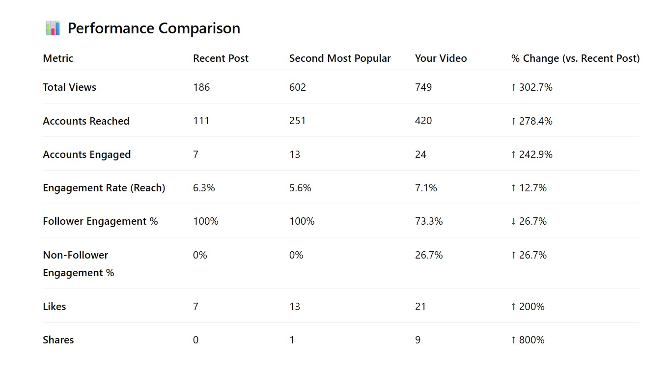 - Enhanced Reach and Engagement: My video achieved a 302.7% increase in total views and a 278.4% increase in accounts reached compared to the recent post. This indicates a substantial improvement in content visibility.